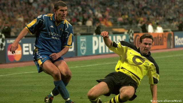 nell'Olympiastadion di Monaco. Una parte fondamentale di quella squadra vincitrice della Champions League fu l'ex Norwich City e l'attuale allenatore dell'Ipswich Town, Paul Lambert, che arrivo' al club nell'estate del 1996 dopo i trascorsi con le squadre scozzesi del St. Mirren e del Motherwell.L'uomo che portò Lambert in Germania fu Ottmar Hitzfeld; che divenne uno dei manager di maggior successo nella storia del club, vincendo i consecutivi titoli di Bundesliga del 1994-95 e del 1995-96. Lambert arrivo' per la prima volta all'attenzione di Hitzfeld quando il Dortmund aveva affrontato il Motherwell nella Coppa UEFA del 1994-95. Al suo arrivo in Germania, Hitzfeld decise di schierare Lambert come centrocampista difensivo, una posizione in cui la determinazione e il duro pragmatico lavoro dello scozzese lo avrebbero visto crescere di molto. Per sua stessa ammissione, Lambert conferma che non è mai stato uno dei giocatori più tecnicamente dotati di quella rosa, il BVB del 1995/96: "Come giocatore ero limitato tecnicamente...di sicuro. Probabilmente ero il peggior giocatore della squadra di Dortmund, una squadra con veri e propri personaggi di livello mondiale. "I giocatori di livello mondiale a cui Lambert qui allude, comprendono artisti del pallone come Karl-Heinz Riedle, Andreas Moller e Matthias Sammer. Sammer, ovviamente, essendo il primo difensore a vincere il titolo di giocatore Europeo dagli anni del grande Franz Beckenbauer, era indiscutibile come proprieta' visive e tecniche... Il calibro dei suoi compagni di squadra - e il relativo anonimato di Lambert, significava che pochi si aspettavano molto da lui quando arrivò a Dortmund. "Ho sempre voluto provare a giocare all'estero e l'agente ha organizzato qualcosa con il Dortmund. All'epoca non avevo nulla da perdere e non sapevo come sarebbero andate le cose". Il suo trasferimento fu un colpo da maestro di Hitzfeld. IlDortmund, anche se non riusci' a vincere un terzo titolo consecutivo di Bundesliga, finendo terzo, visse ugualmente la sua stagione più memorabile in Champions League. Il loro incontro d'apertura nella manifestazione 1997, fu contro la squadra polacca Widzew Lodz, e vide Lambert segnare il suo unico gol della carriera nel torneo, con il Dortmund costretto al pareggio per 2-2. Non fu la migliore delle partenze, ma il Borussia e Lambert finirono per arrivare secondi nel loro gruppo dietro all'Atletico Madrid. In programma seguirono gli scontri ai quarti di finale con l'Auxerre, che il Dortmund supero' con successo, vincendo entrambi gli incontri per un complessivo 4-1. Il turno successivo vide la prima vera prova del coraggio dei gialloneri, dopo essere stati sorteggiati contro il Manchester United in semifinale. Il sodalizio inglese, era considerato il favorito per la vittoria finale, e vantava Eric Cantona, Andy Cole e David Beckham tra le loro fila. Ma come spesso accade nel calcio, le cose non andarono secondo le sceneggiature. Grazie al tenace lavoro di Lambert e dei suoi compagni di squadra, il Dortmund ha mantenne la porta inviolata in entrambe le gare, vincendo sia in casa che in trasferta per 1:0. Il centrocampista del Manchester United Roy Keane elogio' la prestazione di Lambert nel doppio confronto, mentre Lambert stesso confermandosi tipicamente modesto, lodo' l'etica del lavoro dei suoi compagni di squadra, dicendo: "I tedeschi hanno una grande fiducia nelle loro capacità e nell'etica del loro lavoro di squadra oltre ad una mentalita' d'acciaio". La Juventus fu la vincitrice dell'altra semifinale e i campioni in carica. Erano i piu' temibili avversari. Con una squadra composta da giocatori come Zinedine Zidane, Didier Deschamps e Alessandro Del Piero - e avendo già confermato il titolo della Serie A - la squadra Italiana si presentava in ottima forma. Inoltre due anni prima i bianconeri sconfissero la squadra di Dortmund nella doppia finale di Coppa UEFA imponensodi in entrambe le gare con un sonoro 6:1. Paul Lambert e Dortmund dunque erano ancora una volta dati per perdenti. Dato che Zidane era in quel periodo storico, cosi' fondamentale per i successi della Juve, Hitzfeld imparti' a Lambert il compito di marcarlo durante la finale: questa tattica sarebbe stata fondamentale per la vittoria del Dortmund. Si sarebbe ripetuta in pratica la gara tattica che porto' l'Amburgo di Happel alla vittoria in Coppa dei Campioni proprio contro la Juventus. Happel sacrifico Rolff su Platini e blocco' gli sviluppi delle azioni banconere, basate soprattutto sul genio del Francese. Con Lambert che osserva ogni sua mossa, e mordendogli le gambe ogni volta che è in possesso di palla, Zidane non fu in grado di lasciare il suo segno sulla partita e senza la sua scintilla creativa la Juventus non riusci' a creare situazioni pericolose con regolarita'. Nonostante i suoi ligi doveri difensivi, fu proprio Lambert a fornire il cross per il vantaggio del Dortmund, trovando Riedle che ha diligentemente dato il vantaggio prima della mezz'ora ai gialloneri. Cinque minuti più tardi, Riedle raddoppio' per i tedeschi, trovando spazio per staccare di testa da un angolo, per confermare la sua doppietta. La Juventus riusci' a recuperare un goal al 64 'con Del Piero. Tuttavia, la minaccia di una rimonta fu breve poiche' Lars Ricken, fresco entrato come sostituto, ristabili' il vantaggio di due gol al 71 minuto. Era fatta: la partita finì 3-1 e il Dortmund fu incoronato Campione d'Europa per la sua prima Coppa dei Campioni della storia. Lo scopo di Riedle era certamente di segnare, eroismi a parte...Fu sicuramente il Man of the match. Ma per molti: l'uomo della partita fu lo sconosciuto Scozzese che stava nel centro del centrocampo. La solida determinazione fornita da Lambert dalla sua posizione di contenimento e il suo annullamento della minaccia di Zidane diede al Dortmund la base da cui partire con tranquillita'per vincere. Una vittoria che vide Paul Lambert diventare il primo giocatore Britannico a vincere la Champions League con un